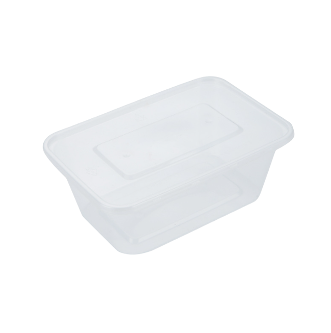 1000ml rectangular container with lid, microwavable. Ideal for takeaway meals.